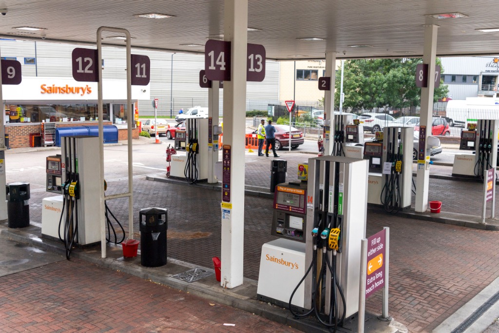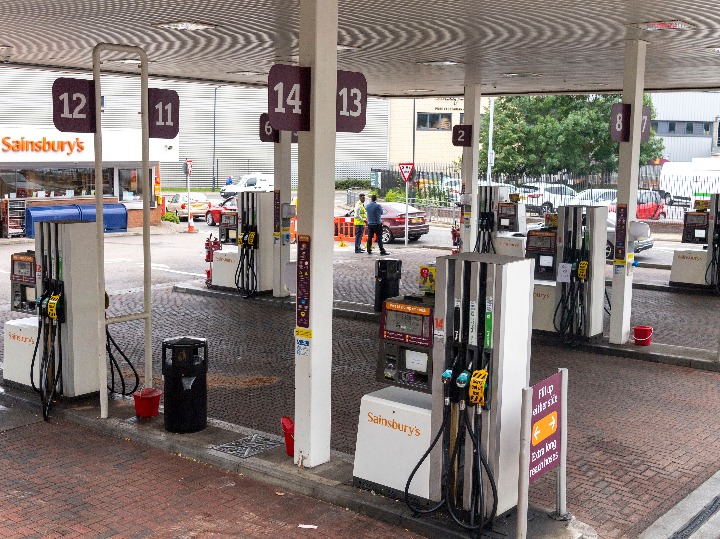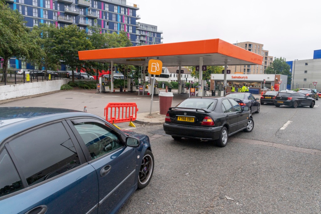 9月25日,车辆从英国伦敦一家停业的加油站旁经过。(新华社发,雷伊·唐摄)