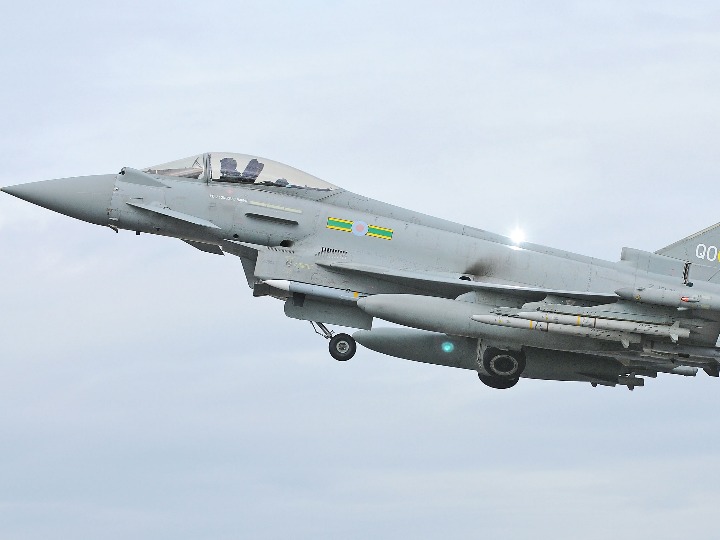 这张英国国防部2011年3月20日提供的照片显示,一架英国空军“台风”式战斗机从林肯郡一个空军基地起飞参加对利比亚军事行动。(新华社发,英国国防部照片)