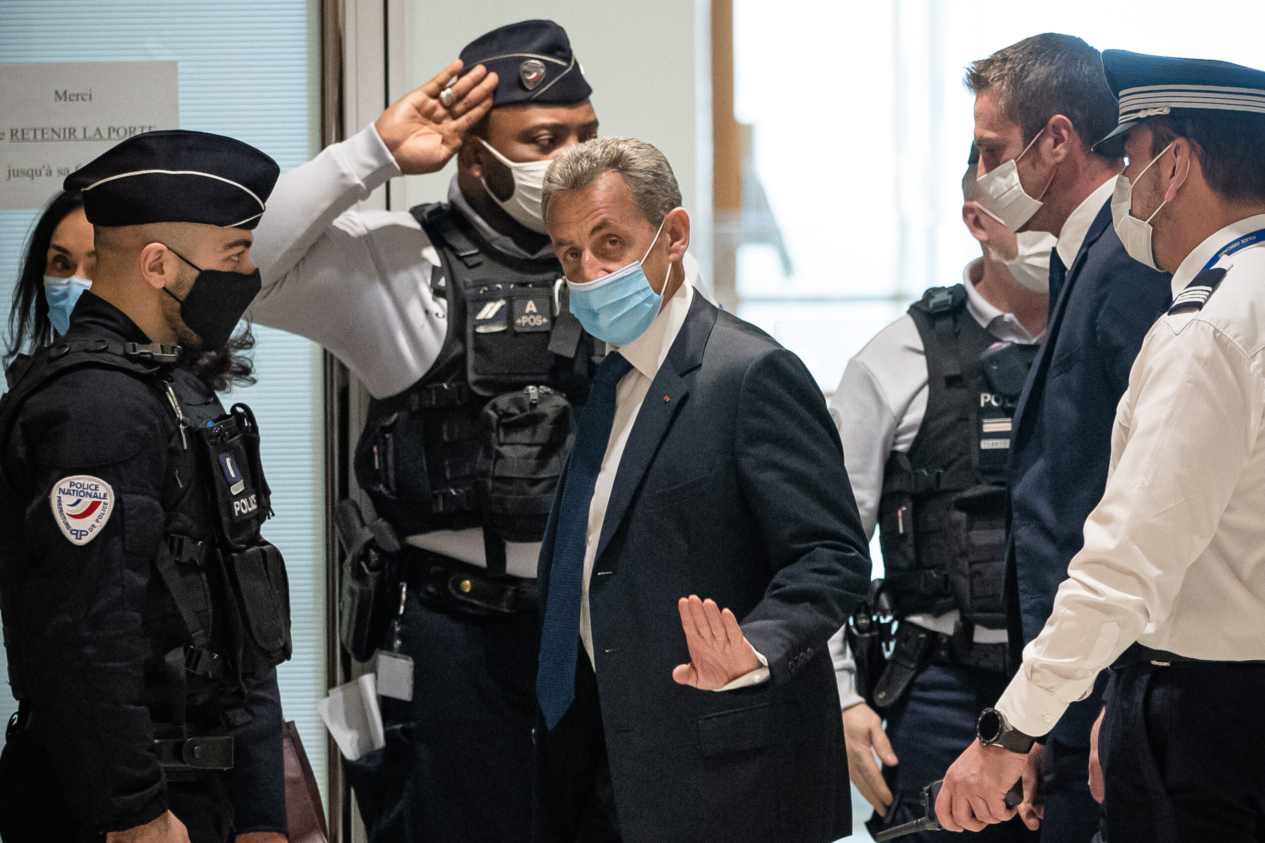 3月1日,法国前总统萨科齐(中)抵达巴黎一家法院。法院当天裁定萨科齐腐败和以权谋私罪名成立,判处其3年监禁。(新华社发,奥雷利安·莫里萨尔摄)