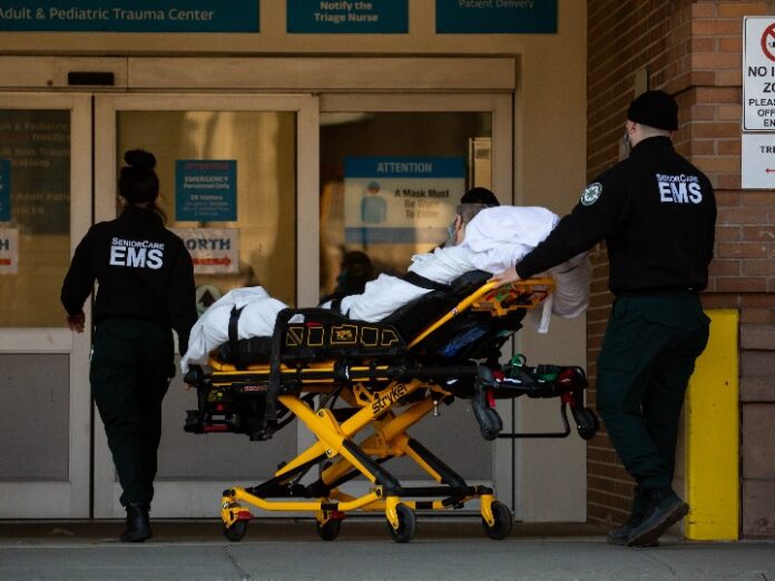 图为2021年3月8日,美国纽约的医护人员在医院外运送病人。新华社发(郭克摄)