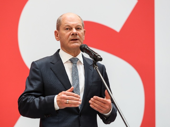 9月27日,在德国首都柏林的社民党总部,社民党总理候选人朔尔茨出席新闻发布会。(新华社记者单宇琦摄)