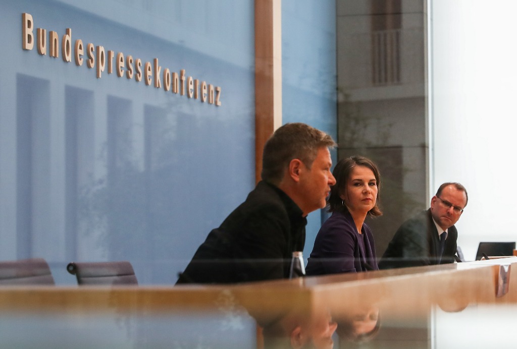 9月27日,德国绿党主席、总理候选人贝尔伯克(中)与绿党联席主席哈贝克(左)在柏林出席新闻发布会。(新华社记者单宇琦摄)