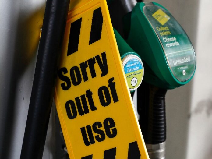 9月27日,英国伦敦一家加油站的加油机上贴着每人限购最多30英镑燃油的告示。(新华社记者韩岩摄)