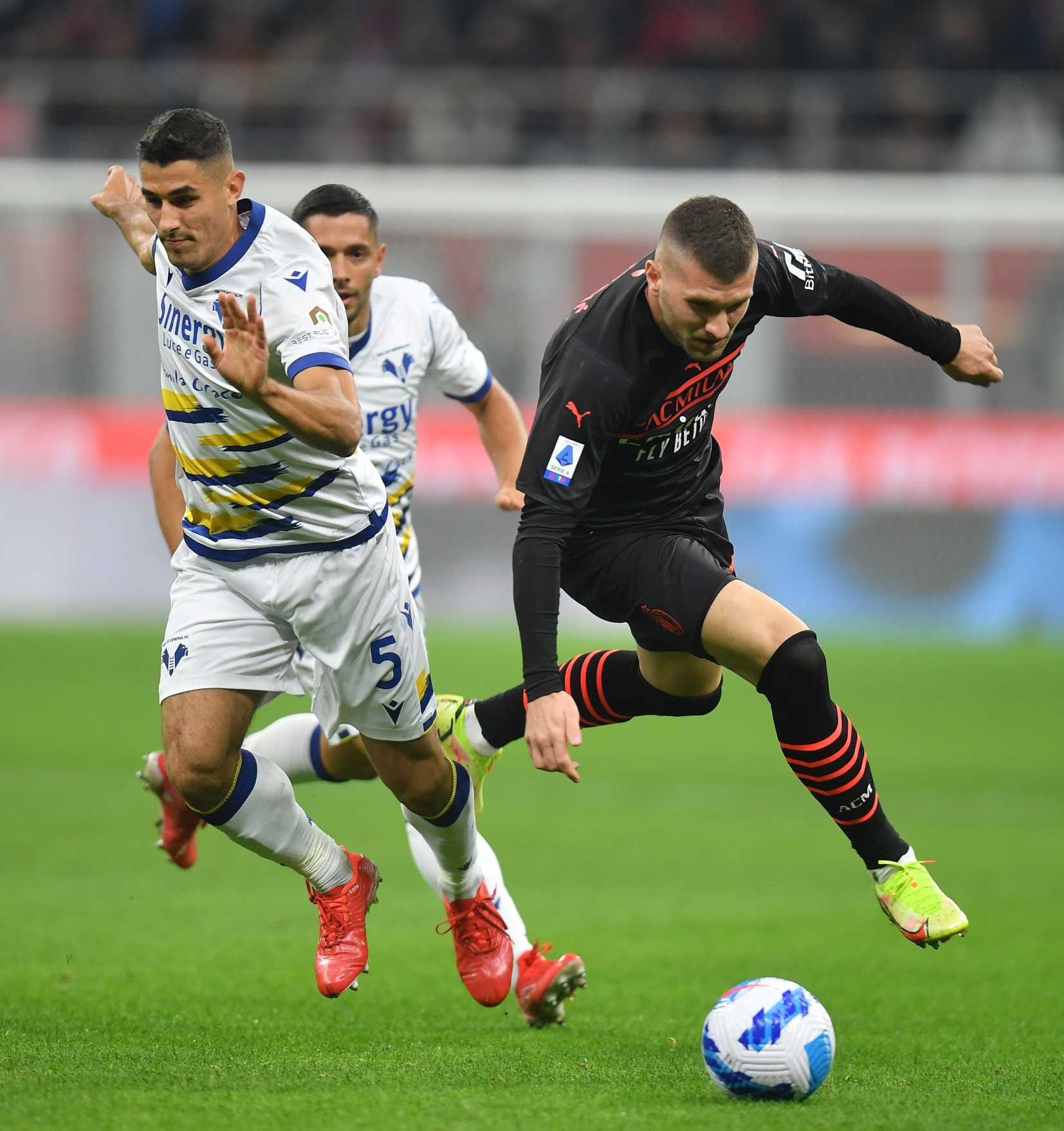10月16日,AC米兰队球员雷比奇(右)与维罗纳队球员法劳尼在比赛中拼抢。新华社发