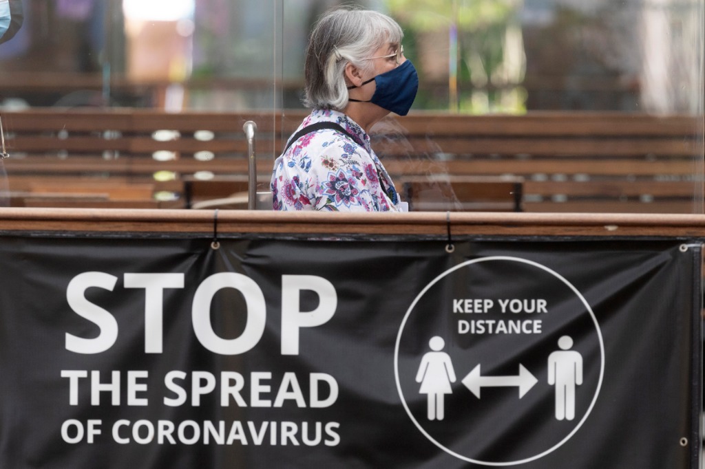 7月19日,一名戴口罩的女子从英国伦敦考文特花园的一处安全提示牌旁走过。(新华社发,雷伊·唐摄)