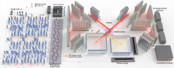 “我们主要有三大突破,首先显著提高了量子光源的产率、品质和收集效率,将光源关键指标从63%提升到92%。其次,将多光子量子干涉线路从100维度增加到144维度,操纵的光子数从76个增加到113个。第三,新增了可编程功能。”研究团队成员、中科大教授陆朝阳说。