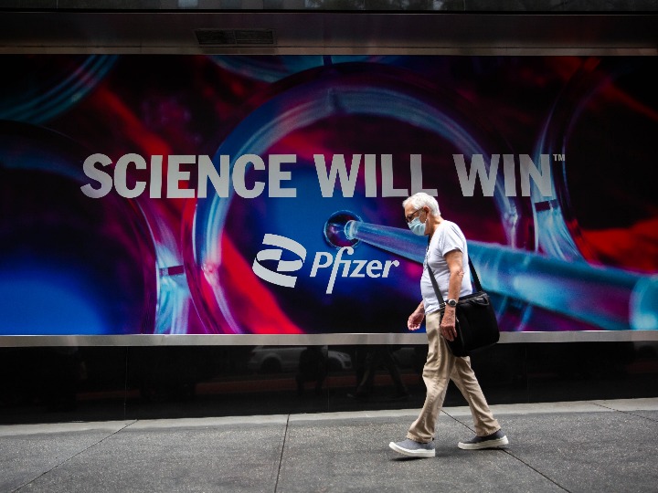 8月23日,行人从位于美国纽约的辉瑞全球总部大楼前走过。(新华社发,郭克摄)