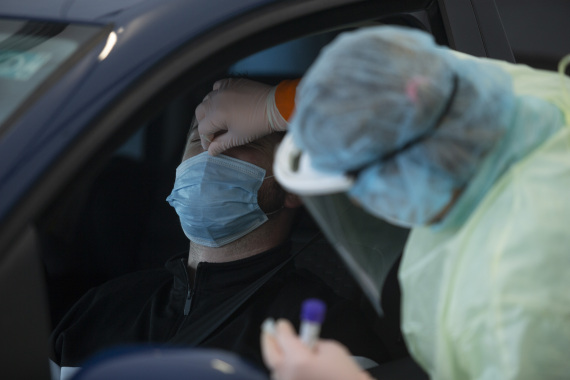 2021年11月4日,在斯洛文尼亚首都卢布尔雅那,医务人员为新冠检测者取样。(新华社发)