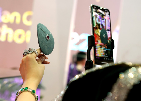 在进博会消费品展区,一家首饰参展商的工作人员在进行“双11”活动直播。新华社记者 刘颖 摄