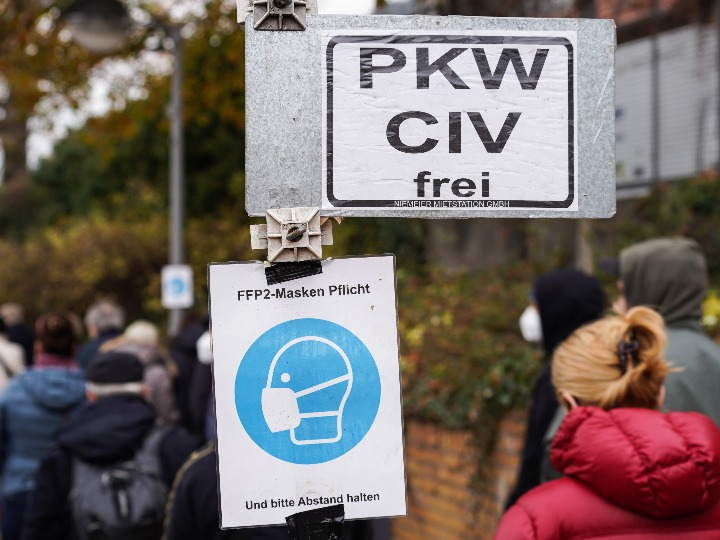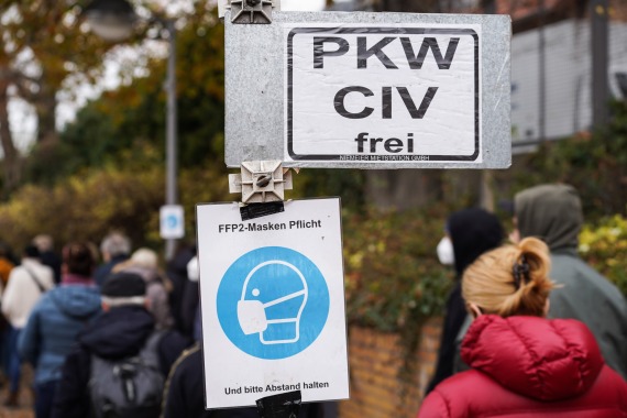 这是2021年11月12日在德国首都柏林一处新冠疫苗接种中心外拍摄的提示排队人群佩戴口罩并保持间距的告示。新华社发(斯特凡·蔡茨摄)