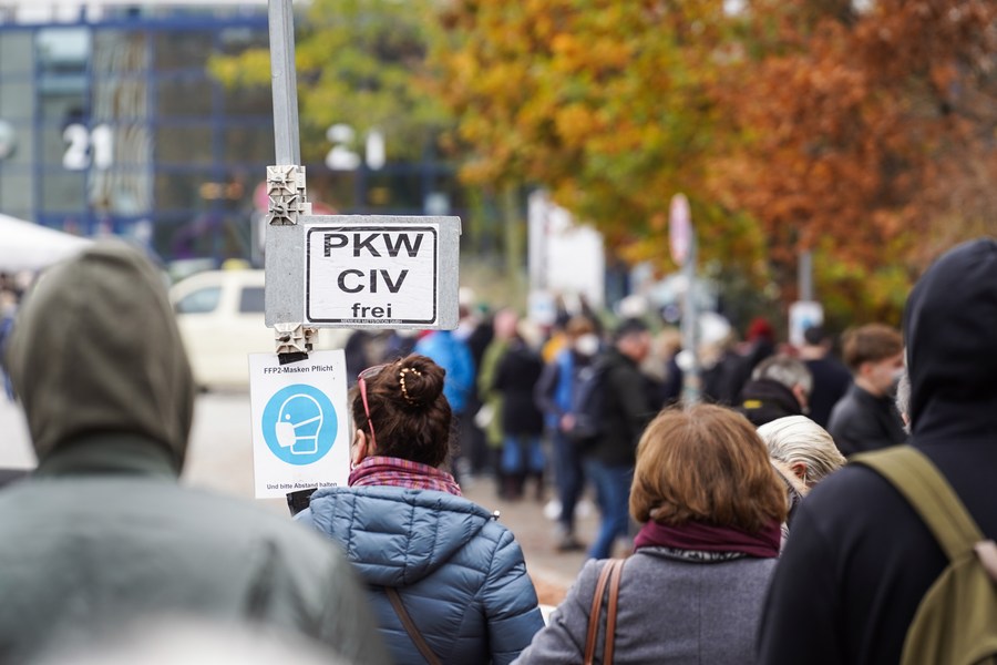 11月12日,人们在德国首都柏林一处新冠疫苗接种中心外排队等待。(新华社发,斯特凡·蔡茨摄)