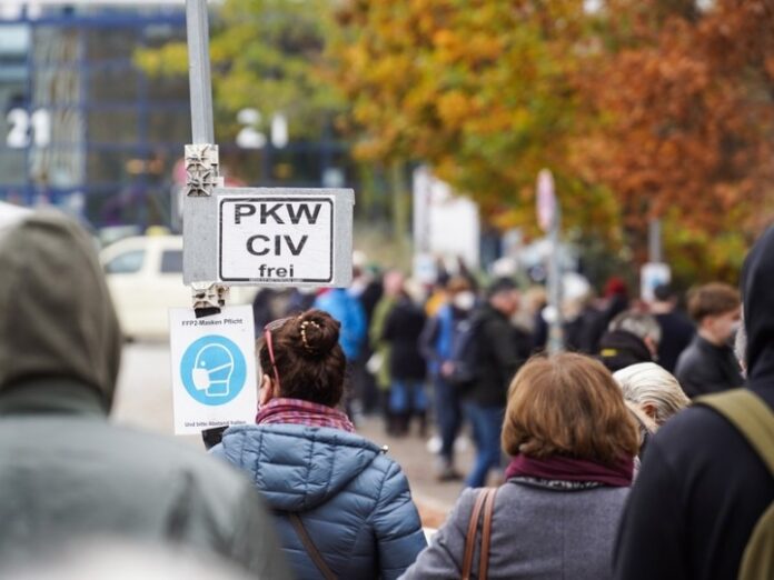 11月12日,人们在德国首都柏林一处新冠疫苗接种中心外排队等待。(新华社发,斯特凡·蔡茨摄)