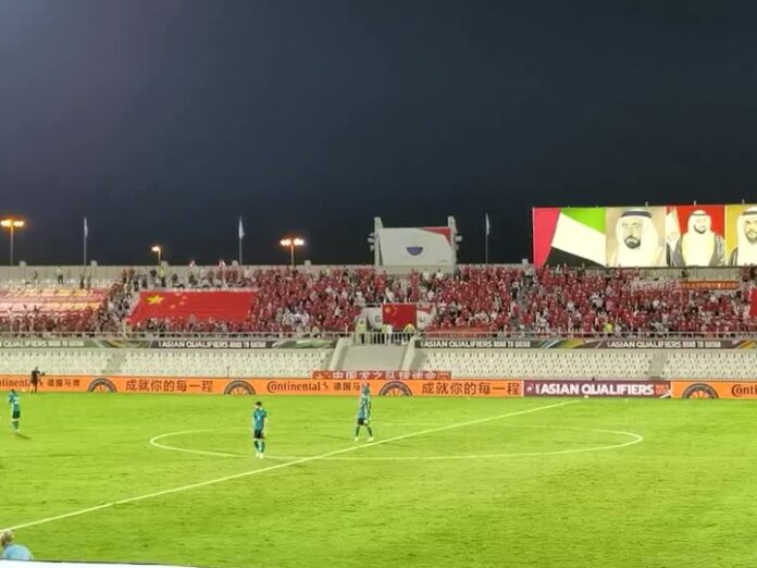 在中国队比分落后时,现场的中国队球迷唱响雄壮的《义勇军进行曲》。第69分钟,澳大利亚队防守队员在禁区内手球,裁判经过VAR提醒判罚点球,武磊主罚命中,中国队将比分追平。