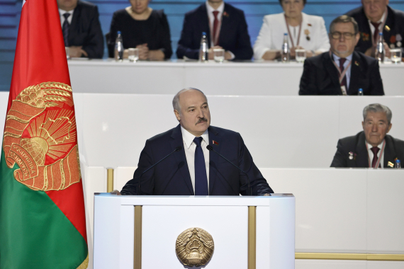 2月11日,白俄罗斯总统卢卡申科(前)在明斯克举行的白俄罗斯第六届全国人民大会上发表主旨报告。(新华社发,白俄罗斯总统新闻局供图)
