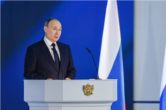 4月21日,俄罗斯总统普京在莫斯科发表国情咨文。(新华社发,叶甫盖尼·西尼岑摄)