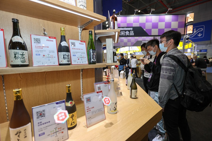 2021年11月6日在第四届进博会食品及农产品展区日本贸易振兴机构展台拍摄的日本酒。新华社记者 王翔 摄