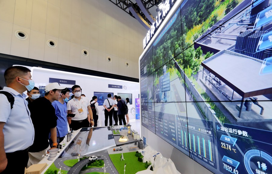 2021年7月8日,参观者在世界人工智能大会一个展示城市智能管理的大屏前交流讨论。新华社记者 方喆 摄