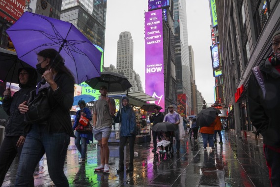 8月22日,人们行走在雨中的美国纽约时报广场上。(新华社记者王迎摄)