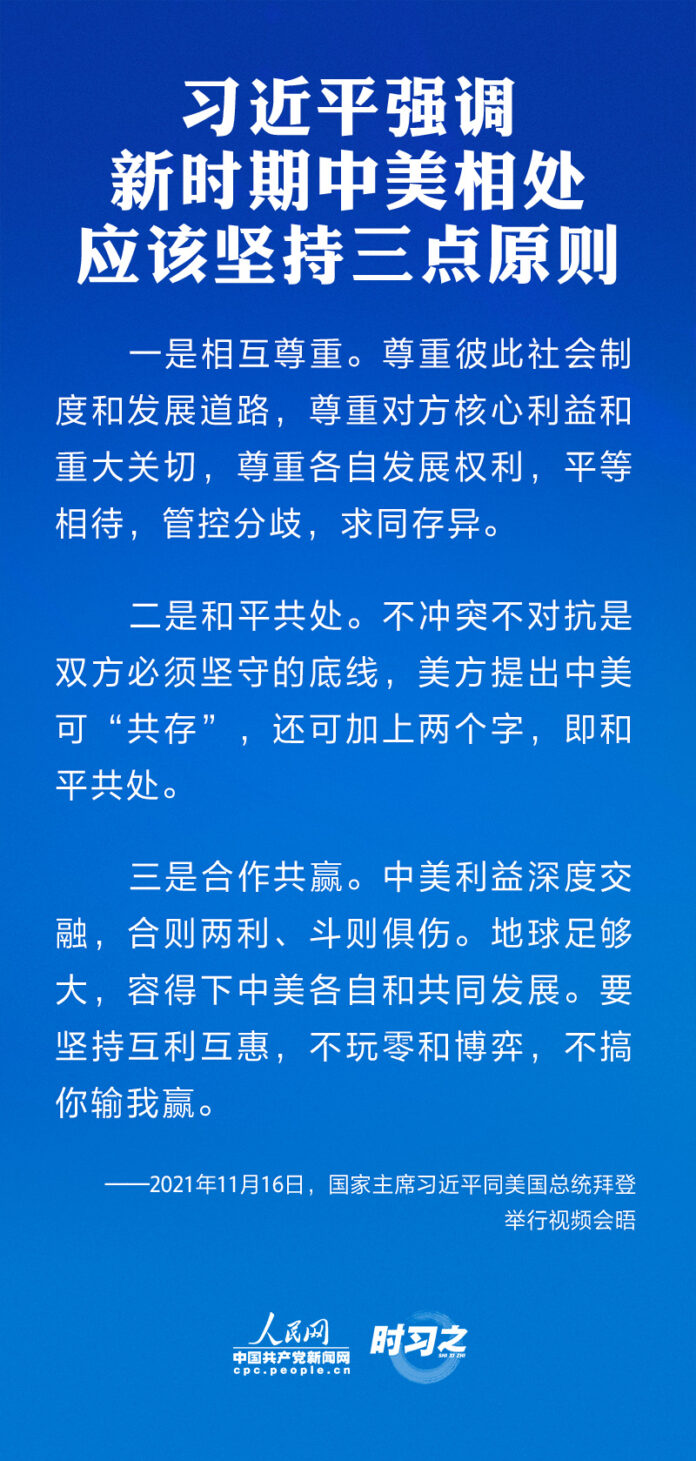 海聚推荐中美元首视频会晤,习近平同拜登谈了这些大事 18 11 月, 202111月16日上午,国家主席习近平同美国总统拜登举行视频会晤。双方就事关中美关系发展的战略性、全局性、根本性问题以及共同关心的重要问题进行了充分、深入的沟通和交流。习近平强调新时期中美相处应该坚持三点原则、中美应该着力推动四个方面的优先事项,并阐述了中方在台湾问题上的原则立场。