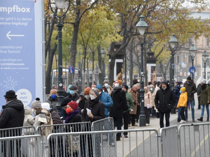 11月15日,市民在奥地利维也纳市政厅前的新冠疫苗接种点排队等待接种新冠疫苗。(新华社记者郭晨摄)