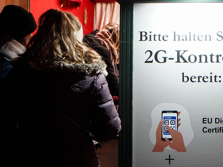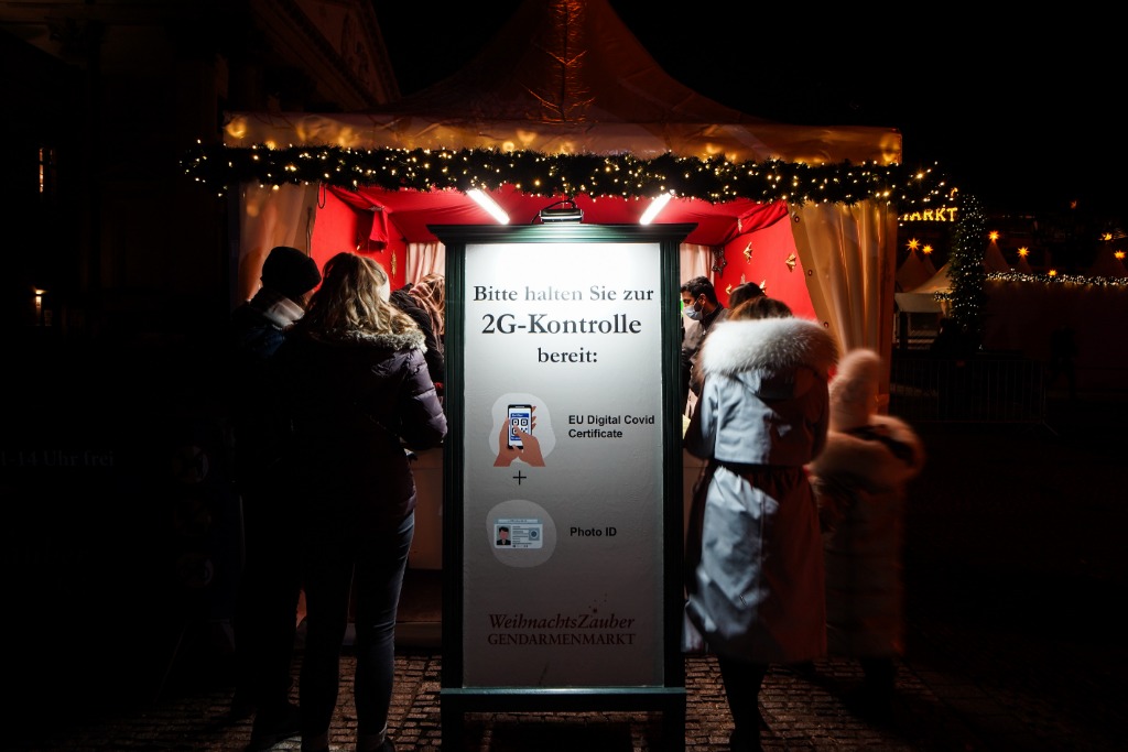 11月22日,在德国首都柏林的宪兵广场,人们在圣诞市场的入口接受新冠疫苗证明或康复证明的检查。(新华社发,斯特凡·蔡茨摄)