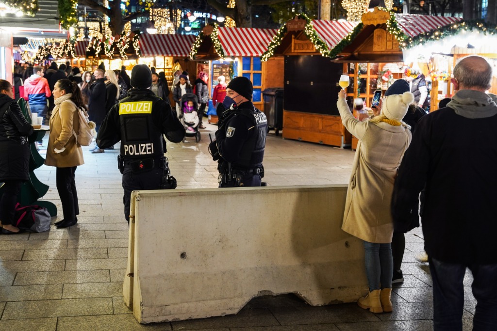 11月22日,在德国首都柏林的布赖特沙伊德广场,两名警察在圣诞市场执勤。(新华社发,斯特凡·蔡茨摄)