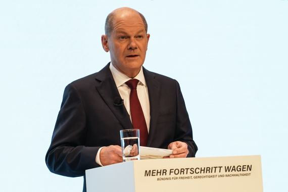 11月24日,在德国首都柏林,德国社民党总理候选人奥拉夫·朔尔茨出席介绍组阁协议的新闻发布会。(新华社发,斯特凡·蔡茨摄)