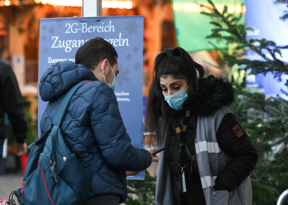 11月22日,在德国法兰克福圣诞市场外,一名工作人员检查市民的健康通行证。受新冠疫情影响,德国柏林、法兰克福等地的圣诞市场有的取消,有的在较为严格的防疫措施下开放。(新华社记者逯阳摄)