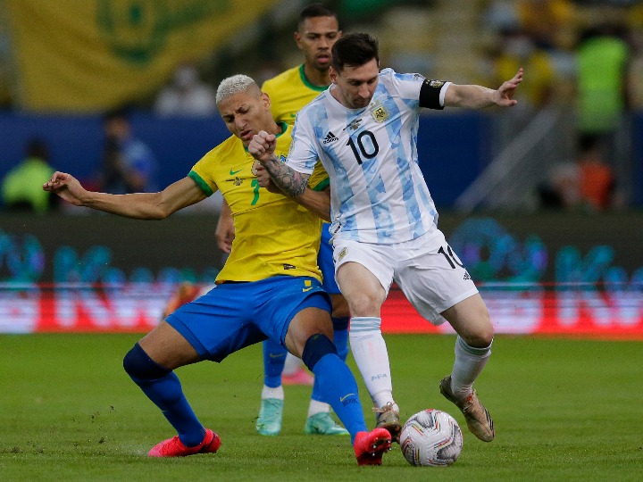 7月10日,阿根廷队球员梅西(右)与巴西队球员理查尔里森(左)在比赛中拼抢。当日,在巴西里约热内卢举行的2021年美洲杯决赛中,阿根廷队以1比0战胜巴西队,获得冠军。新华社发(卢西奥·塔沃拉摄)