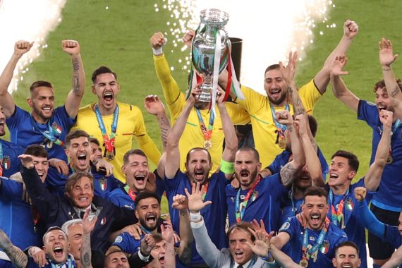 7月11日,在英国伦敦进行的欧洲足球锦标赛决赛中,意大利队在点球大战中以3比2战胜英格兰队,夺得冠军。新华社/法新