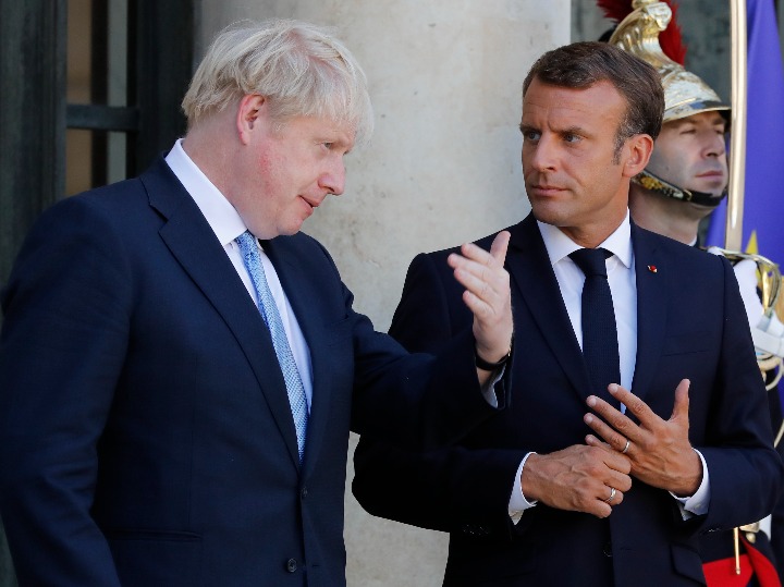 2019年8月22日,在法国巴黎,法国总统马克龙(右)与来访的英国首相约翰逊交谈。(新华社发,杰克·陈摄)