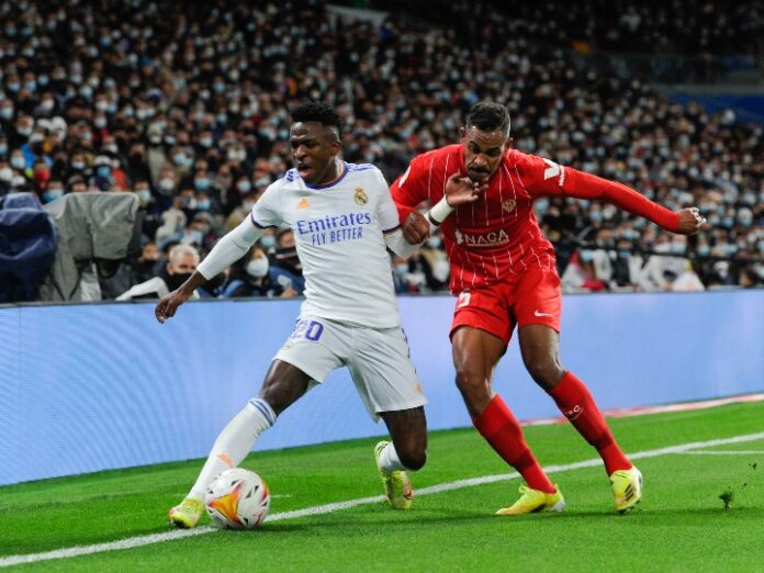 11月28日,皇家马德里队球员维尼修斯(左)在比赛中拼抢。新华社发(古斯塔沃·巴连特 摄)