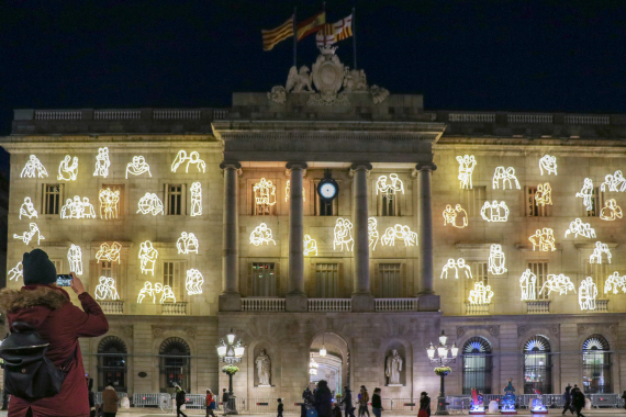 1月3日,在西班牙巴塞罗那市政厅外,一名女子在拍摄“拥抱”主题的节日彩灯。新华社发(伊斯梅尔·佩拉科拉摄)
