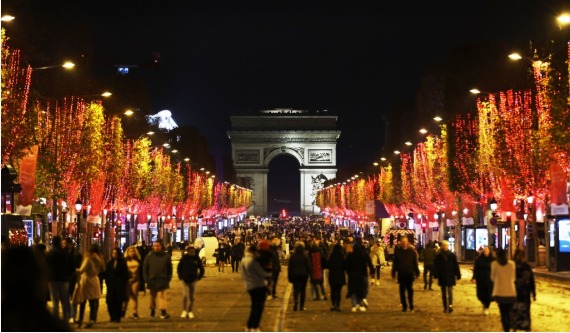 11月21日,人们走在点灯后的法国巴黎香榭丽舍大街上。(新华社记者高静摄)
