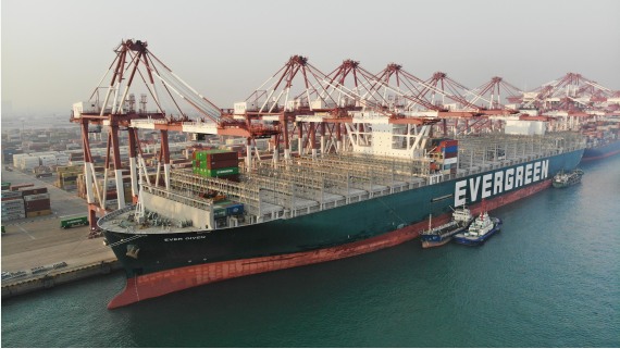 11月13日,“长赐”号货轮在山东港口青岛港前湾集装箱码头装载货物(无人机照片)。(新华社记者李紫恒摄)
