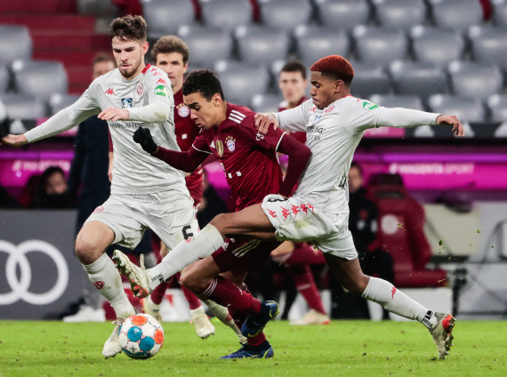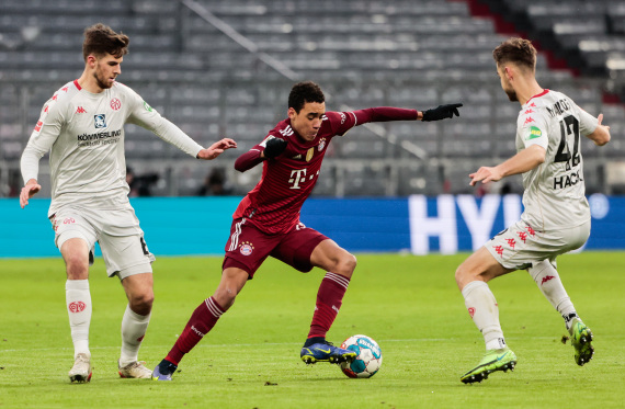 12月11日,拜仁慕尼黑队球员穆夏拉(中)在美因茨队球员施塔赫(左)与哈克的防守下控球。新华社发(菲利普·鲁伊兹摄)