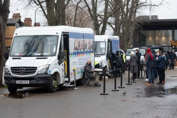 12月6日,在英国伦敦,人们在新冠疫苗接种车旁排队等待。(新华社发,雷伊·唐摄)