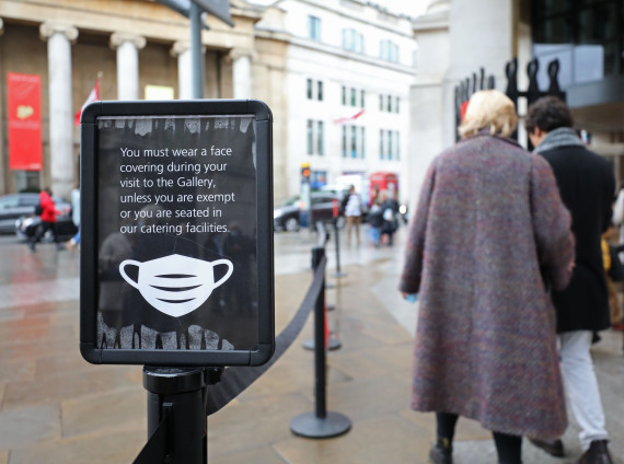 2021年12月12日,在英国伦敦,人们经过英国国家美术馆门前要求参观者佩戴口罩的提示牌。(新华社记者李颖摄)