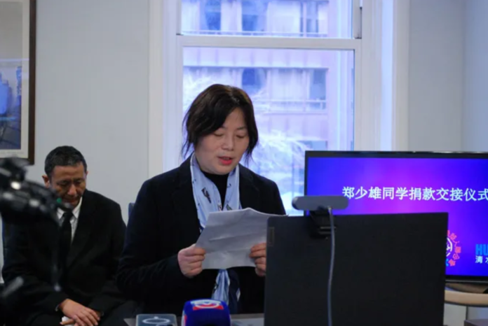郑少雄母亲在捐款交接仪式上致辞(芝加哥侨学网)