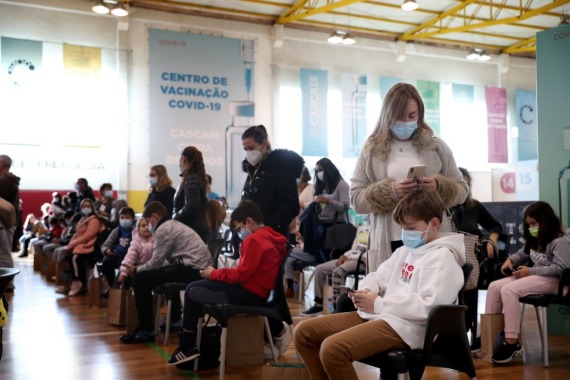 12月18日,孩子们在葡萄牙卡斯凯斯的一处接种中心留观。(新华社发,佩德罗·菲乌萨摄)