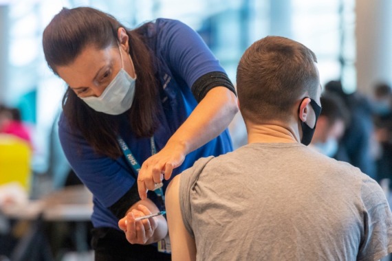 12月19日,一名男子在英国伦敦温布利体育场疫苗接种中心接种疫苗。(新华社发,雷伊·唐摄)