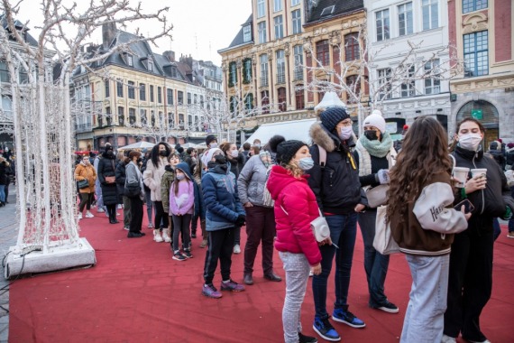 12月22日,在法国北部城市里尔,人们排队等待进入圣诞市场。(新华社发,塞巴斯蒂安·库尔吉摄)