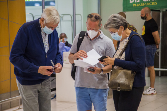 11月29日,旅客在南非开普敦国际机场查看新冠病毒检测结果。(新华社发,弗克摄)
