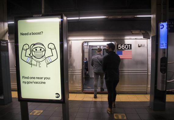 这是1月9日在美国纽约一处地铁站内拍摄的新冠疫苗加强针广告。新华社发(郭克摄)