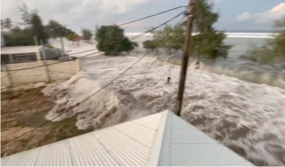 火山喷发引发海啸。社交媒体上流传的视频显示,巨浪冲上海岸,淹没道路,涌入民宅。15日傍晚,首都努库阿洛法已停电。