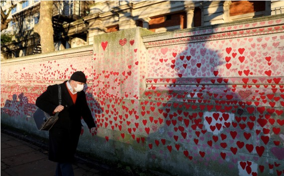 1月13日,戴口罩的行人走过英国伦敦泰晤士河畔的国家新冠纪念墙。(新华社记者李颖摄)