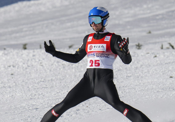 2021年12月5日,“相约北京”系列测试赛2021-2022国际雪联北欧两项洲际杯个人大跳台+10公里越野滑雪比赛在张家口赛区国家跳台滑雪中心、国家越野滑雪中心举行。图为奥地利选手法比奥在大跳台比赛中。新华社记者胡虎虎摄