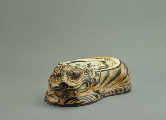 用卧虎做枕头,夜夜“枕虎而眠”,中国古人用虎元素来做“文创”的巧思,不免令人叫绝。仔细看来,这件虎枕前低后高,背部正好是平滑的枕面,可谓融艺术造型和舒适度为一体。