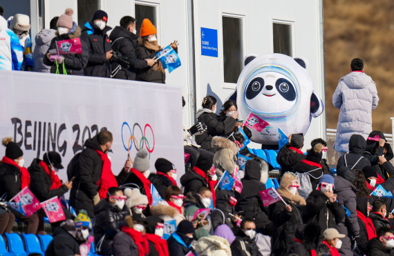 2月6日,2022年北京冬奥会越野滑雪男子双追逐(15公里传统技术+15公里自由技术)比赛,吉祥物“冰墩墩”在现场与观众互动。新华社记者刘潺摄