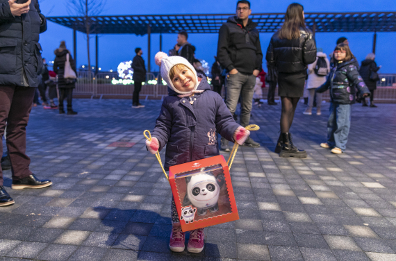 在塞尔维亚贝尔格莱德举行的中国灯展上,一名儿童手拿北京冬奥会吉祥物“冰墩墩”。新华社发(王韡摄)